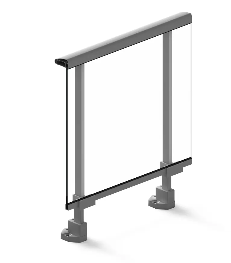 Disfruta de excelentes vistas sin ningún tipo de obstáculo, gracias a este sistema de barandilla basado en un perfi l de aluminio con forma de “U” sobre el que se fija vidrio laminar de seguridad templado. Posibilidad de iluminación con tira led y solución de drenaje para zonas expuestas. Opción de perfil embellecedor de
